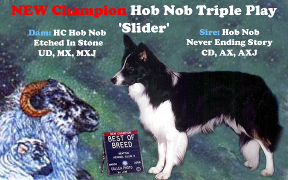 When Jan asked me if I wanted to be the little tri-boy's mom, I had no idea what a fantastic journey that pup would take me on. He is my sweetest momma's boy who wants to do everything, and the faster the better! He never runs out of energy and willingness to work and he tries so hard to make sure he gets his job done right. He is the ultimate teammate and I can't imagine my life without him. As a trainer, he is the first dog I have earned any kind of championship with. And although I am proud to say that Slider was owner trained and handled to all four of his championships, I must admit that Slider made it easy for me by being an exceptional dog. It seems weird to be writing this as it sounds like the ending of a long story but my little baby boy will just turn 4 years old in September of 2007! After finishing his breed championship when he was 17 months old, Slider has been busy and I've been trying to keep up with him! This year (2007) was the culmination of his other three championships as he earned his HC on 26 May, his OTCH on 21 July and his MACH on 18 August. It still seems unreal that we did it! And although the four championships came relatively quickly for Slider, it truly is the result of the years of dedication Jan DeMello, Slider's breeder, has put into her tremendous breeding program that consistently produces dogs that are capable of what Slider has accomplished. Slider and I will continue to compete in agility and herding plus we are going to start tracking to see if we can get that elusive fifth championship. Slider is a dream come true and this is just the beginning of that fantastic journey with my Amazing Sliderman! Thank you Jan!!!