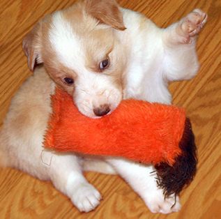 When the puppies are about 5 weeks of age, they get moved into the Puppy Cottage. Puppies continue to experience human interaction and play sessions several times a day. A sound effects CD is played throughout the day exposing them to such sounds as thunderstorms, dogs barking, children crying, loud gun shots, etc. This is the same sound effects CD that is played by the Guide Dogs for the Blind in CA when raising their own litters.